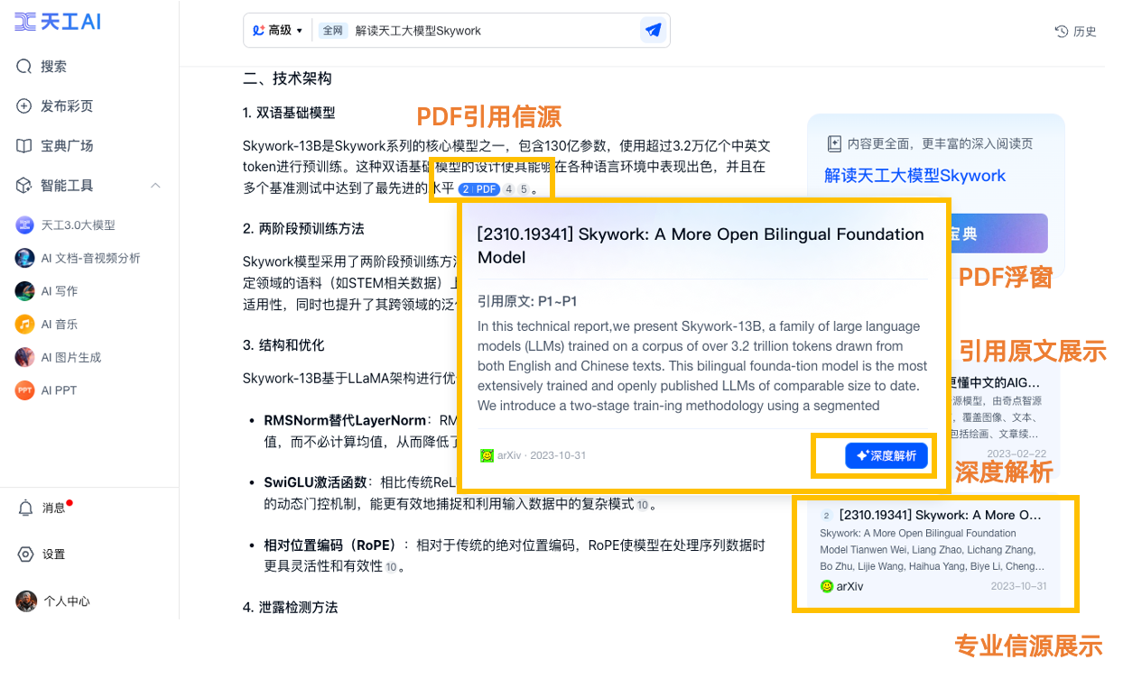 天工AI高级搜刮正在文档AI阅读阐发范畴取得了冲破性进展,精确识别问题的焦点并供给深度洞察。具备杰出的多条理阐发推理能力。确保最终成果的精确性。添加了新的交互和功能:PDF援用信源、PDF浮窗、援用原文展现、深度解析、专业信源展现。图文并茂的沉点解读阐发研究方式、尝试成果等论文焦点内容